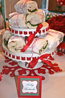 I am so excited to share Bloom’s first official party submission with you.  It comes from my dear friend, Lauren- mother, wife, and party planner extraordinaire.  She just hosted a Christmas lunch for the mothers in her daughter’s first grade class.  Lauren used traditional Christmas colors with crisp, clear, classy detail.   I just adore the twine ribbon on the sandwiches and the candy cane centerpiece.  You can find more of Lauren’s parties around the web by clicking here and here.