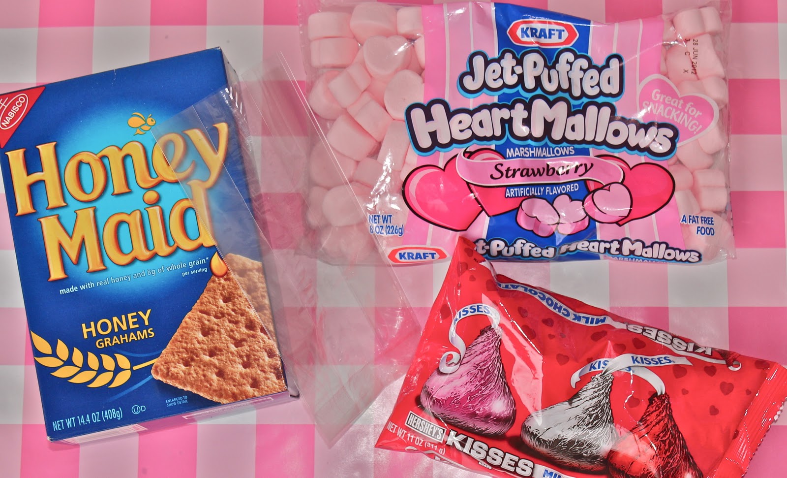 Supplies: cellophane bag, Hersey Kisses, Kraft HeartMallows, graham crackers