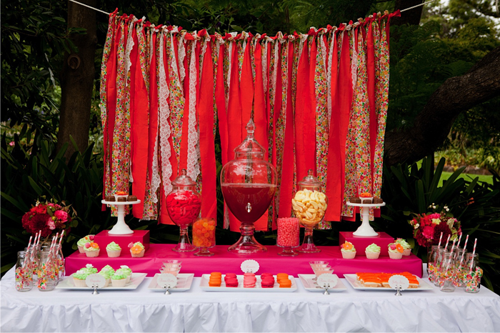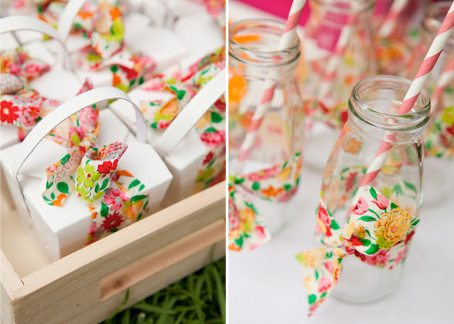 Absolutely love the bright, hot color scheme which is a bit unusual for floral tea party. It’s daring, brave, exciting. It’s a much bolder color scheme than I usually feel comfortable using which might be why I’m attracted to it. I also adore the fabric ties around the drink bottles and Chinese food carriers. It’s a great way to add texture and color to the party. Using the print in larger areas could create chaos. Perfect editing.