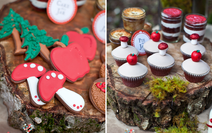 I think this may be one of my favorite dessert tables. Definitely in my top 5 but, it’s really hard for me to pinpoint exactly why. I think it’s because it captures the theme perfectly. You can look at the photo and immediately know what the inspiration was without it being a typical Red Riding Hood Table. I also love the red, pink, moss green and brown color scheme. The setting doesn’t hurt- gorgeous! The modern clean design of the food is a great juxtaposition to the woodsy, natural setting and serving vessels. It creates the perfect mood for the party.