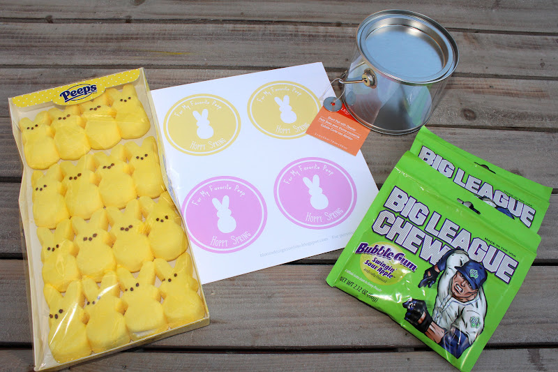 To make, you will need Marshmallow Peeps, Sour Apple Big League Chew or Edible Easter Grass (found at Target), a clear paint pail (carried at most craft stores) or a cellophane bag, and my printable tag.  If you are using the pail, I would recommend printing the tag on full label sheets and the punching out with a 2.5 inch punch.  If you are making this in a bag, print on bright white card stock.