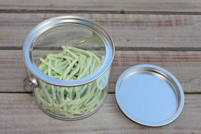 Fill the bottom of the bucket with “grass”, line  the pail with bunny peeps, and close the lid and put on your sticker.  Add a cute ribbon and your done.