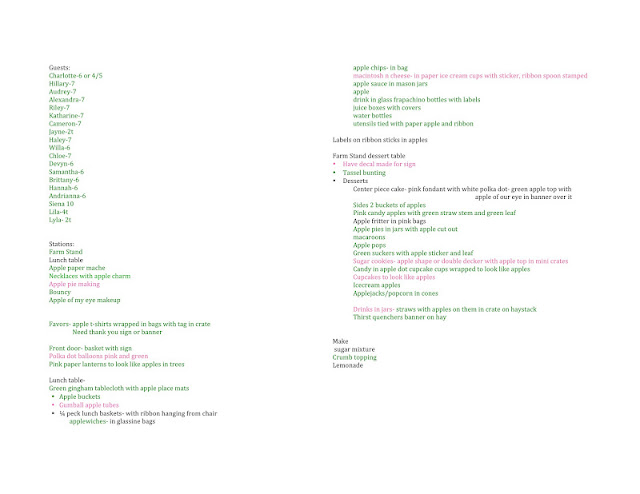 Then, I use my brainstorming notes to make a party checklist/to do list.  I always start with the guest list and then list the areas/tables at the party (dessert station, craft table, beverage table, etc.)  Then, I separate out each of these areas and list all of the things I need for them- supplies, printables, etc.  As I complete each item, I change the font color.  It helps to me feel good when actually see that I am making progress.  I always use black for initial list, then another color for in progress (pink) and a third color for totally complete (green).  When the party favor is made and wrapped I change the guest name.  This list is actually always changing as the party prep progresses.  Usually I have to delete some of the food or desserts that I have planned simple because I have to much.
