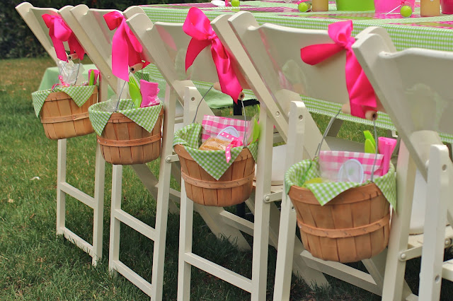 For example, at my Apple Of Our Eye Party, I decided to serve lunch in bushel basket. They were lined with the green gingham fabric I had found for cheap and then tied with a ribbon to the chairs- adorable decorations. Then I had to come up with ways to make the food highlight the theme of the party.