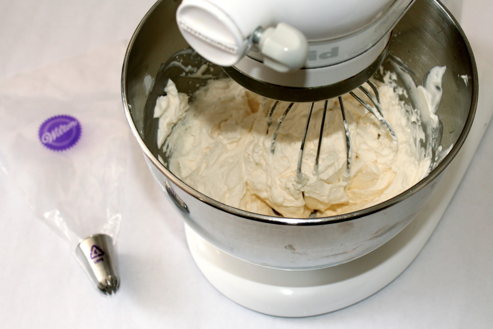 Add all the ingredients to the mixer attached with your whip and slowly start to mix.  Once all the powdered sugar is incorporated, turn to high and whip away.  Don’t walk away- it will separate into curds if you let it go to long.  It should be thicker than generic shaving cream.  Put the whipped cream into a piping bag (or bowl if you are using it for another recipe) and it will save for a good 24 hours- probably longer but I have never tried.