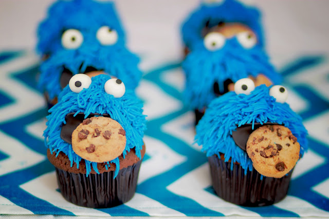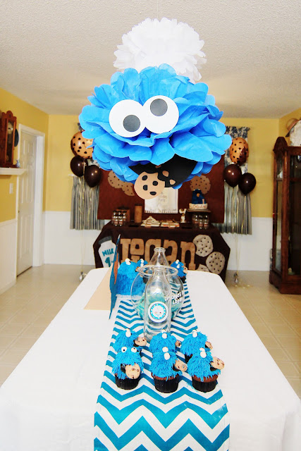 Those cookies, along with a Cookie Monster cake and cupcakes were served to our guests. Milk was the obvious drink of choice. I wanted to make sure everything was cohesive. The color scheme was brown and blues. The focal point was the dessert table that the cookies and main cake was featured on. That area I wanted to be primarily brown with the idea that as you grazed on cookies galore the color scheme would then carry you to the kitchen island where blue as well as Cookie Monster become the focus.