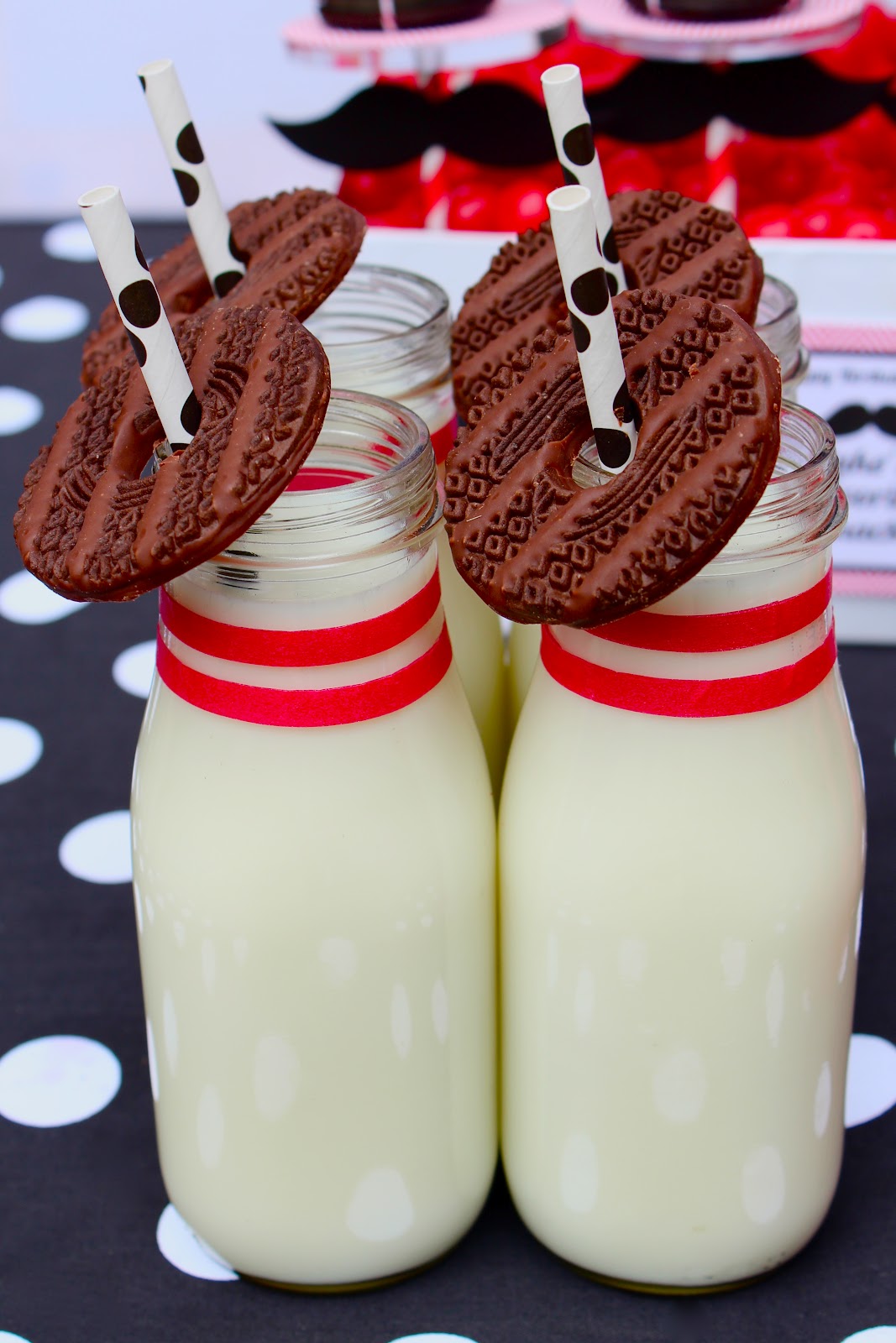 The color scheme of the dessert table was black and white with pops of red.  Round treats included a fun whopper covered cake, oreo cakester cake, bowling pops, ice cream sandwiches on stache sticks and donut balls.  The kids also got to make a sweet stache at the candy table, which had all red candies that played on the theme of the party.  My favorite dessert element was the milk jars to which I added red tape to create bowling pins.