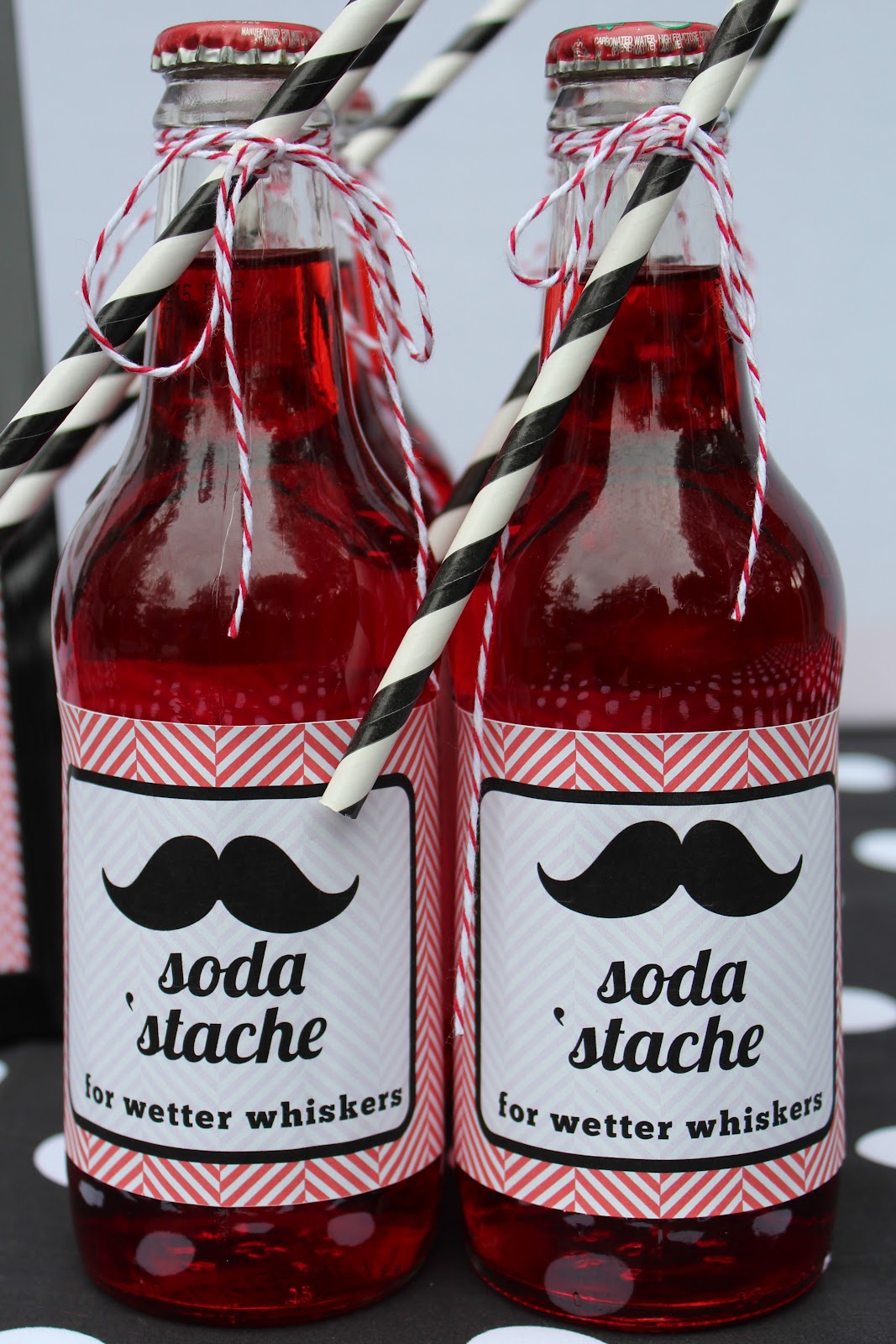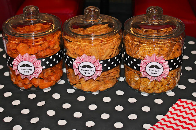 As the boys left, they took home personalized muslin bags filled with things that roll and gumball tubes.  For the printable, I used a manly herringbone pattern and black and white polka dots to play up both the man and bowling aspects of the party. The ‘staches collection available here includes everything form invitations, to the food labels, water bottle wraps, juice box covers, straw flags, banners and more.