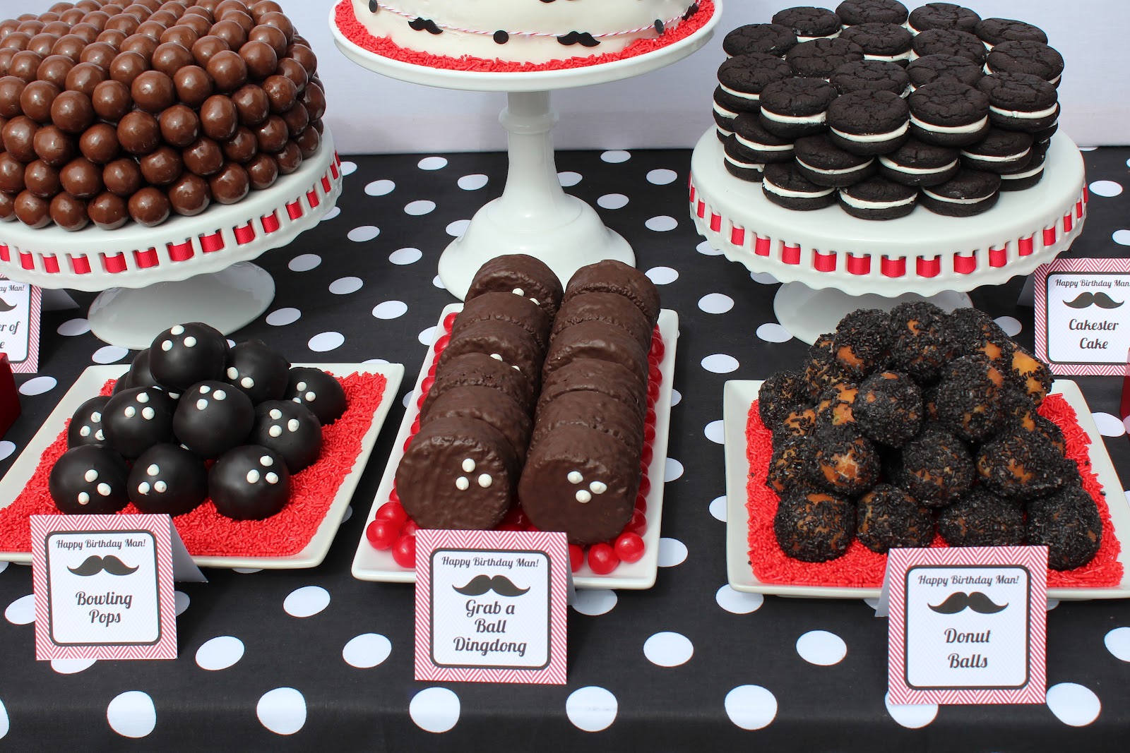 For the booths, I simply filled vases with sour cherry balls and cut out a bowling ball, mustache and the number 6.  I made placemats to match the other printables. Then added white dots to black paper plates to change them into bowling balls