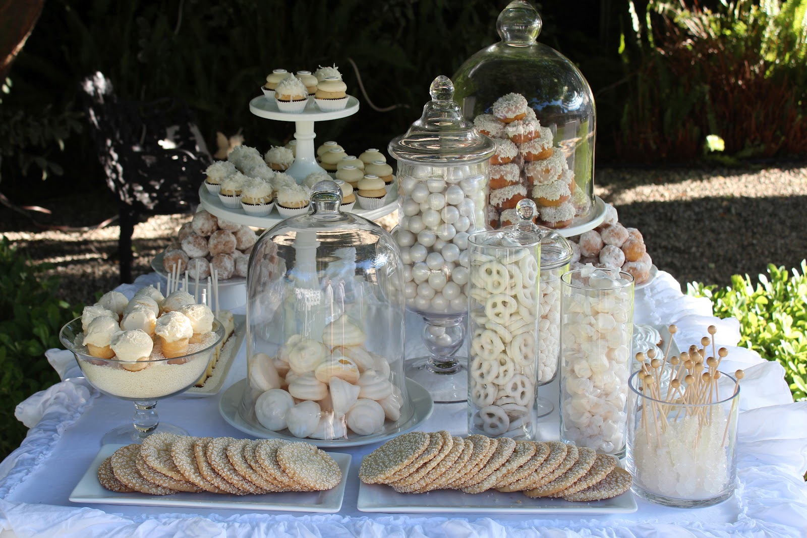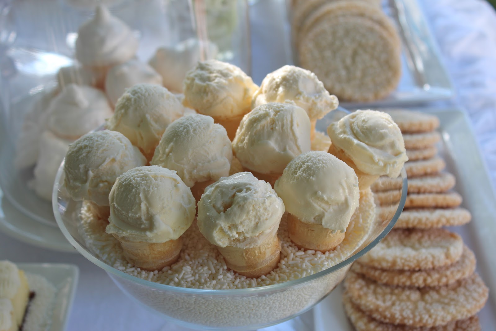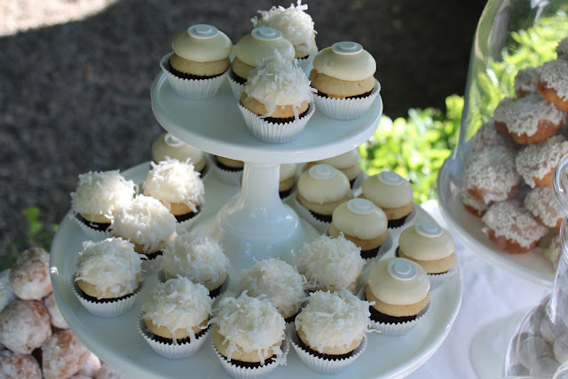 Last weekend I had the most incredible time hosting an adult “white” party with 4 of my dear friends.  No printables or banners, just white hot fun!  I love hosting parties with a color for the theme.  It just pulls the party together.  Guests were asked to wear white and all of the decorations, drinks and food played on this theme.  For hors d’oeuvres, guest snacked on a white cheese and a crudité platter.  Dinner featured white sea bass, mashed potato bar and sauteed white corn.  The dessert table was filled with mini vanilla and coconut cupcakes, mini white donuts, vanilla ice cream mini cones, cheesecake bites, white chocolate mousse shots, and meringue tarts along with white candy.