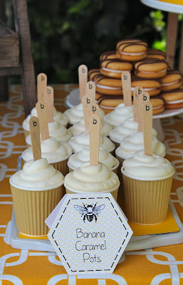 When my dear friend, Tracy, asked me to do the printables and dessert table for her son, Brendan’s first birthday, I was so honored. Tracy has amazing style and knew exactly the feel she wanted for Baby B’s party- modern, classy with a little bit of vintage. Tracy had picked the graphic marigold fabric for the tablecloth on the dessert table and wanted to use burlap and twine accents. She made the adorable paper mache bees for decorations and centerpieces and wrapped tin cans with twine to continue the vintage feel on the tables. It was fun helping her bring her party vision to life!