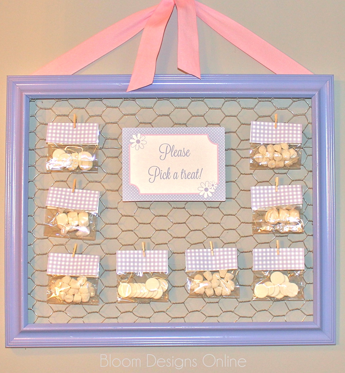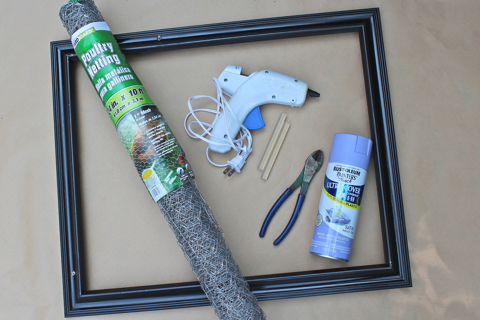 One the back side of the frame, glue down one side of the wire with your hot glue gun.  Wait for the glue to harden.  Once it’s secure, you will be able to pull the rest the wire taunt and then secure to the other sides of the frame.  Attach ribbon to each side of the frame if desired.