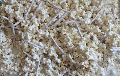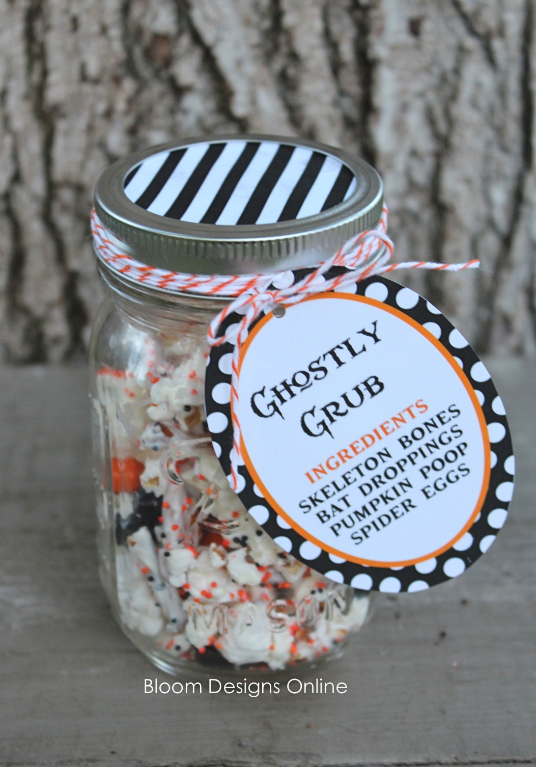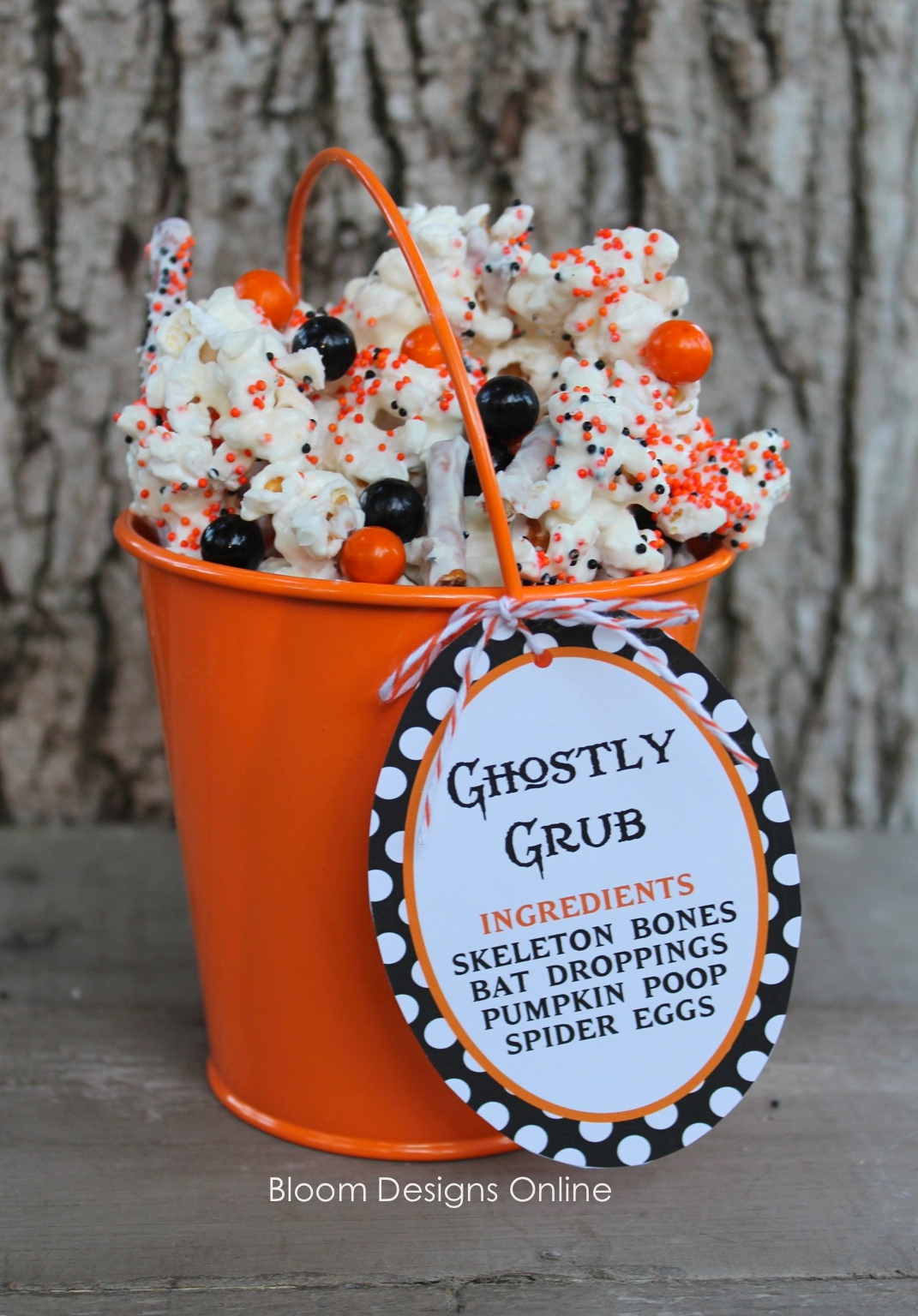 If you’ve read my blog of any amount of time, you must have anticipated this post!  Ghostly Grub takes my basic party popcorn and turns it into a yummy Halloween treat made with some spooky ingredients.