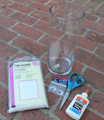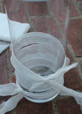 Wrap the cheesecloth around the hurricane. Tie the pieces together to create a mummy effect. Add in extra ties if you need more.