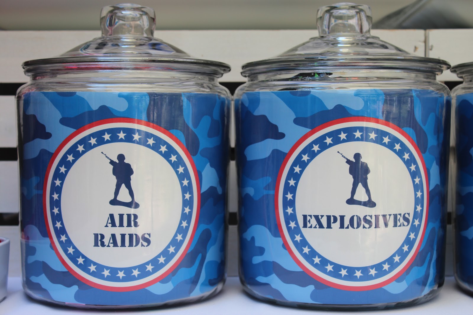 My son’s favorite part was of course the dessert table! After singing, “Happy Birthday” to Davis, all of the boys treated themselves to Air Raids (Air Heads), Explosives (Pop Rocks), Soldiers (Gummy Soldiers), Rescue Ropes (Red Vines), Blow-Ups (gumball tubes standing at attention), and Bombs (cake pops with a detonator on the top.) In line with the silhouettes used throughout the party, the plastic soldiers “at battle” with one another adorned the cupcakes.