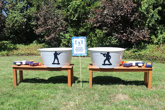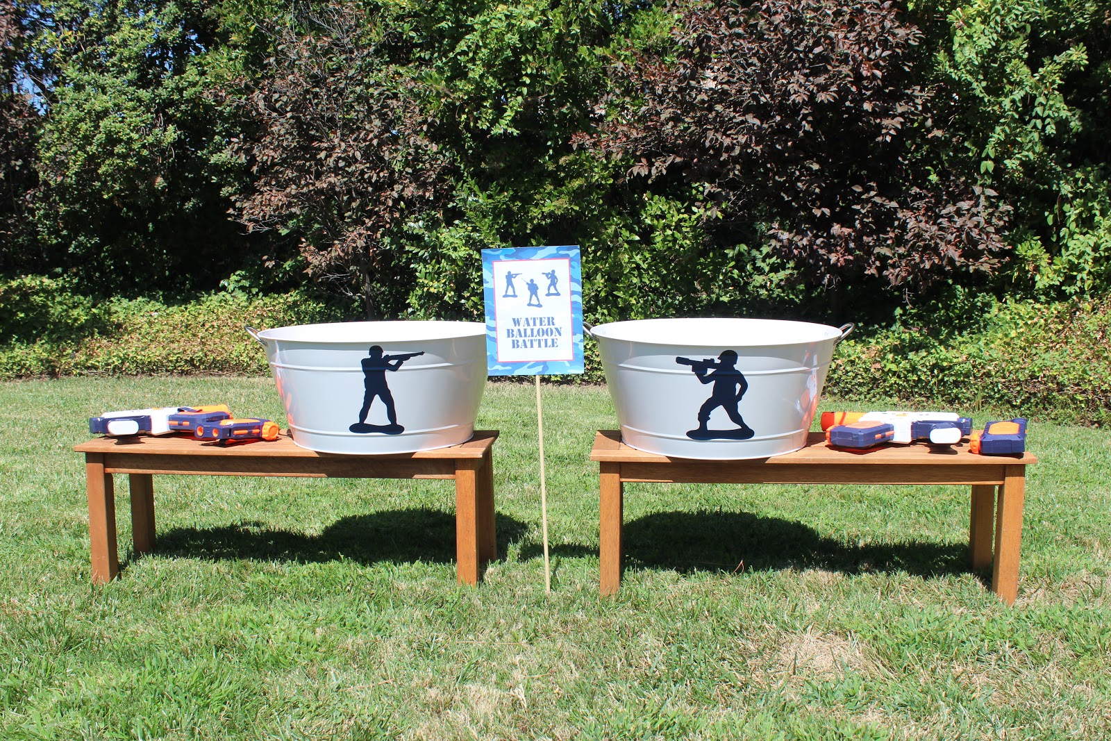 Upon arrival to the Bender Boot Camp, the boys walked up a path lined with American flags and Bronze Star mylar balloons as a subtle honor to Davis’ Uncle Tyson, who pained the kids’ faces with authentic cami paint that would not wear off in the pool. Once the young grunts were ready to go, it was time to train! Major Tyson formed two teams and ordered the boys to race through an obstacle course where they had to military low crawl under camo nets, football run/jump through 8 tires, swim across the pool and “shoot down the enemy” by knocking down a row of one inch high plastic army men using a water gun. After completion of the course, it was time to test their strength with tug of war. The losing team would fall into the pool. Once boot camp training was complete, it was time for final battle! A water balloon fight ensued between the boys and a few dads.