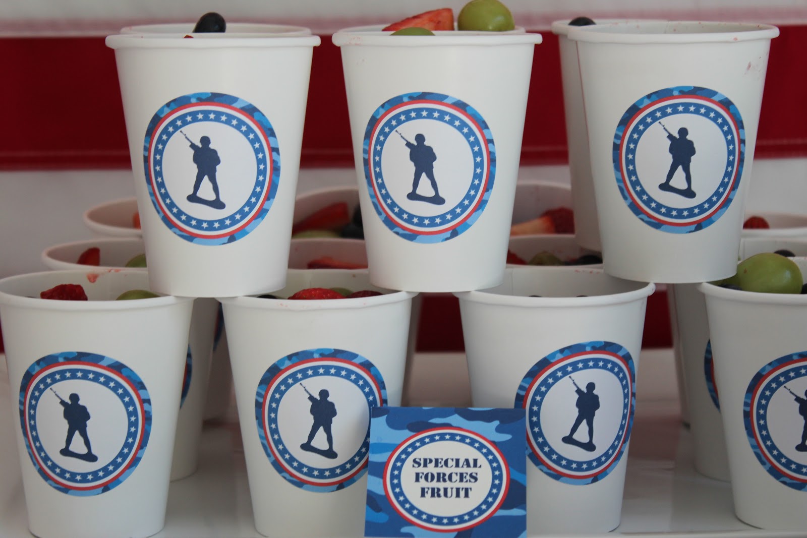 The military theme can be somewhat “heavy” because of the very serious nature behind what they do. Although my family has a deep respect for the military, for the sake of a 6 year old birthday party, I wanted to “lighten the mood” a bit. With that being the case, I chose to incorporate images of toy soldiers throughout the party to create a lighter, more whimsical feel. Instead of traditional green camouflage, I opted for a blue camouflage to enhance the party with a trendy, fresh, modern look befitting 6 year old boys. This also allowed me to weave in red, white and blue decor to create a patriotic spirit.