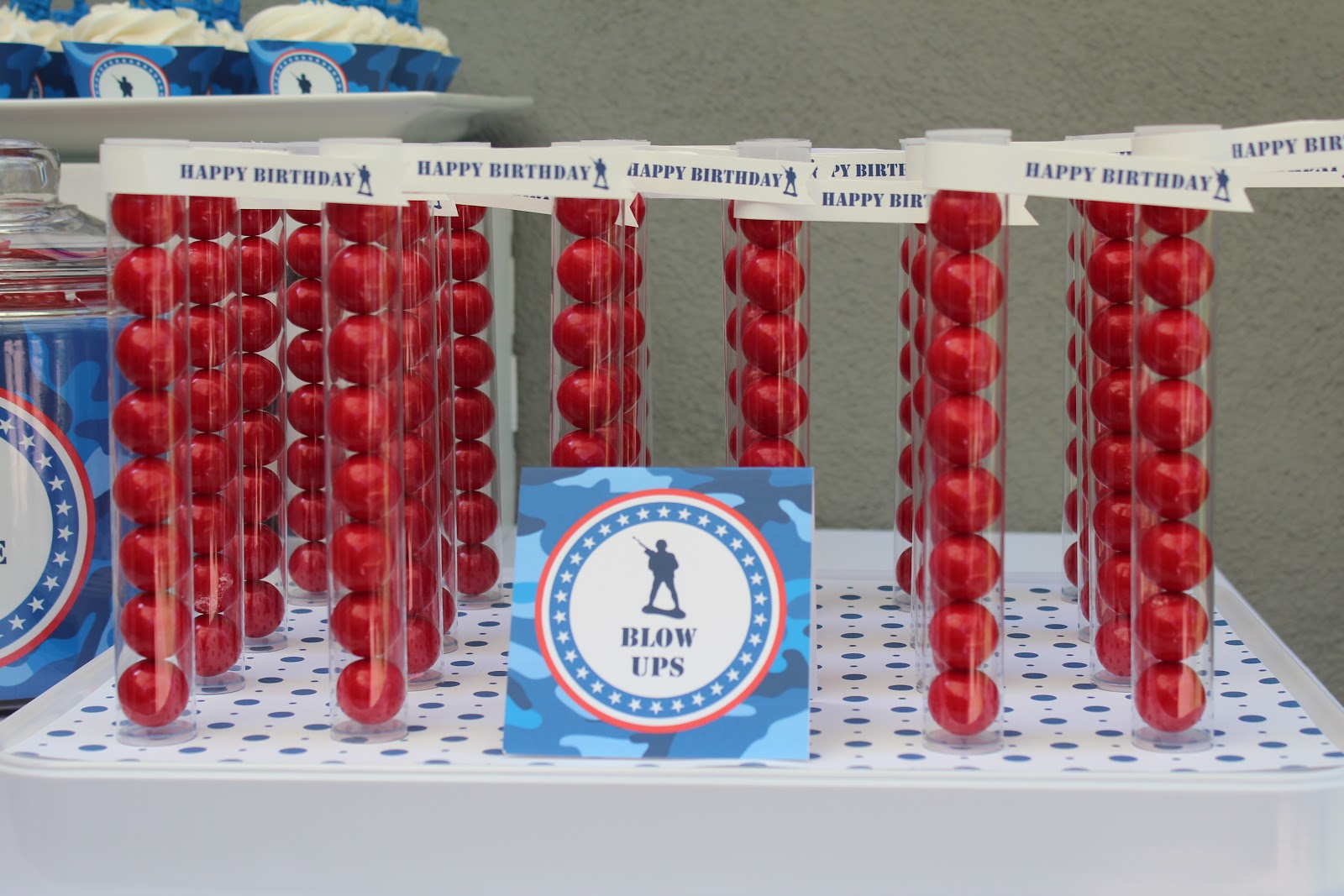 The military theme can be somewhat “heavy” because of the very serious nature behind what they do. Although my family has a deep respect for the military, for the sake of a 6 year old birthday party, I wanted to “lighten the mood” a bit. With that being the case, I chose to incorporate images of toy soldiers throughout the party to create a lighter, more whimsical feel. Instead of traditional green camouflage, I opted for a blue camouflage to enhance the party with a trendy, fresh, modern look befitting 6 year old boys. This also allowed me to weave in red, white and blue decor to create a patriotic spirit.