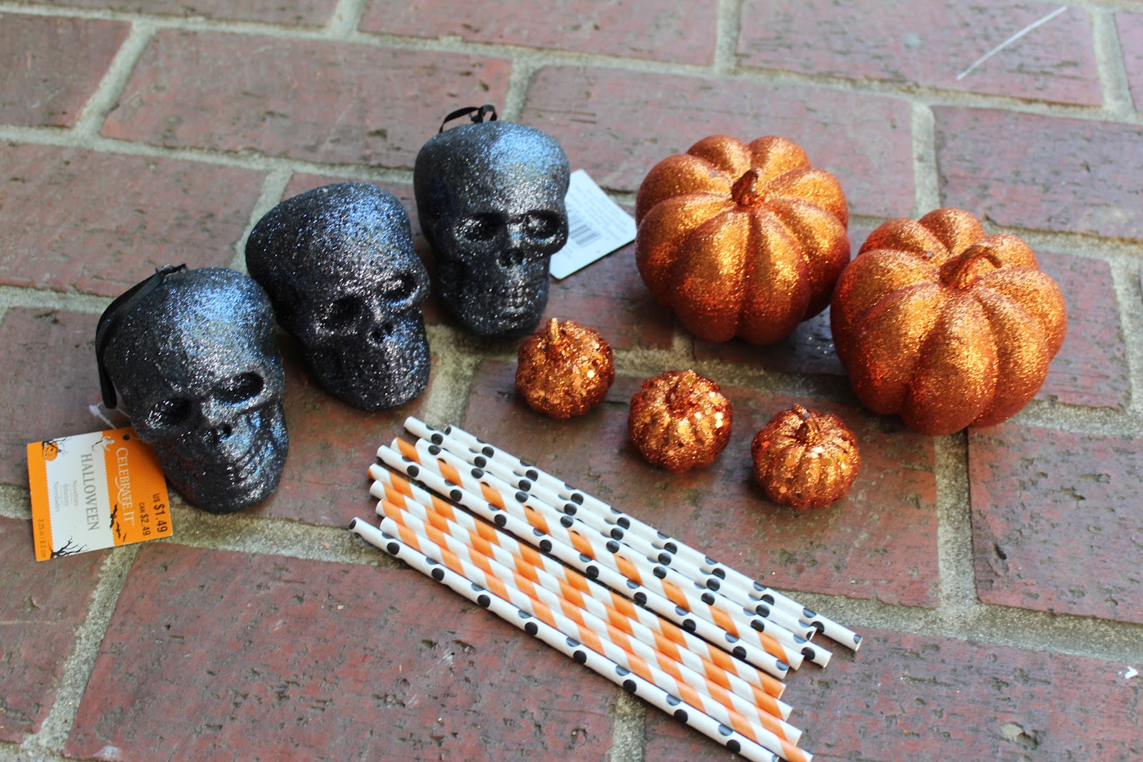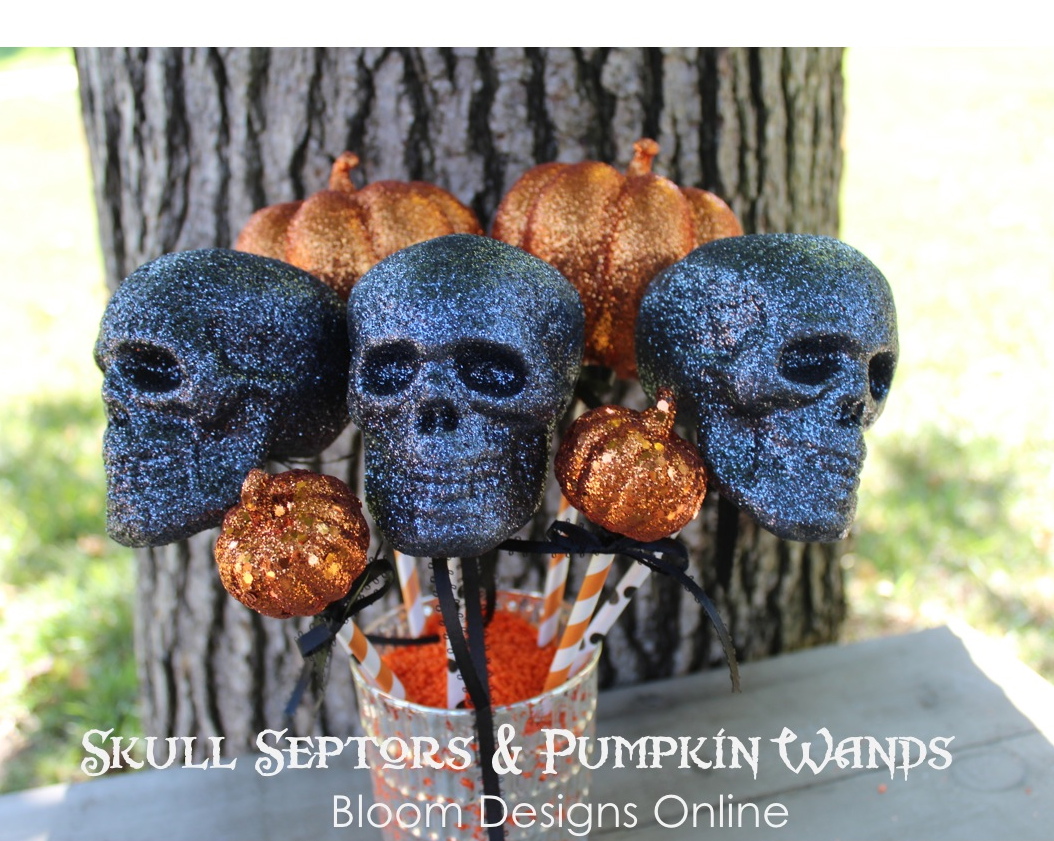 You need pre-glittered skulls and/or pumpkins found at Target or Michael’s, paper straws or other stick, ribbon and craft glue.