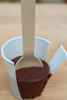 Once mixture is set remove from mold or cups. I made several small cuts in the plastic cup and then peeled down.  Add marshmallows.  I stuck my marshmallows onto the spoon with a dab of melted chocolate.
