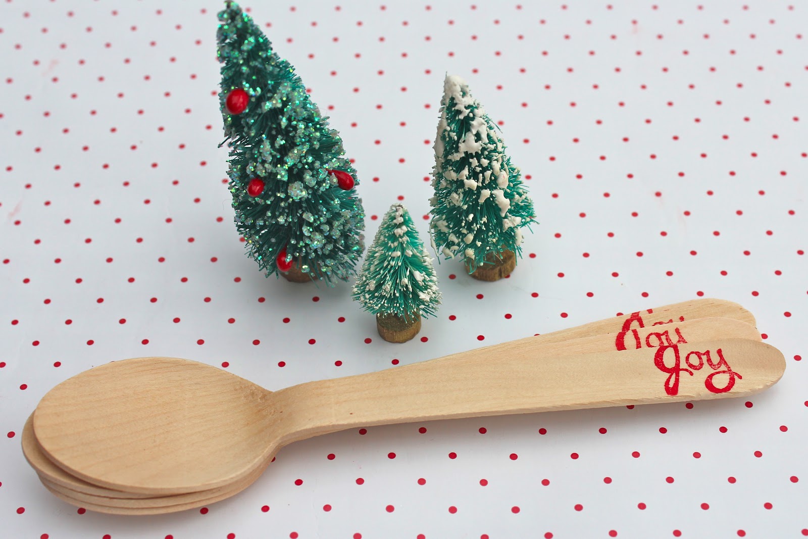 There are lots of ways to make these fun hot chocolate spoons!  I have seen the chocolate blocks on wooden sticks, on silver spoons and even just cut into cubes.  This is my version. I wanted to use wooden spoons available here stamped with the word joy but I