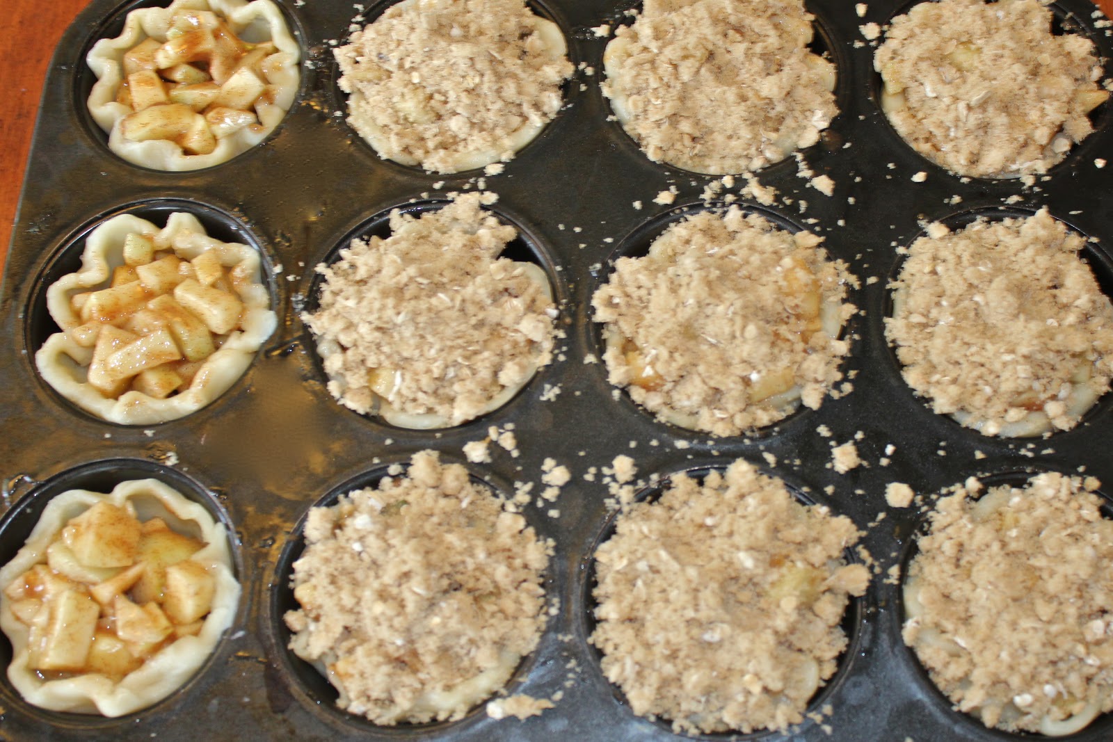 Fill each pie crust with the apple mixture and then cover with crumb topping.