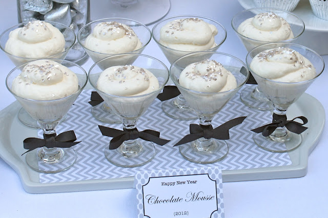Looking for a easy and beautiful New Year’s Eve dessert? Here it is. This recipe for white chocolate mousse can be made in the morning and will hold nicely until midnight. Add edible glitter and a bow to your serving cups to match the colors of your party. These small details will elevate your dessert from fine to fabulous. For a New Year’s Eve celebration, I thought the mini martini glasses were perfect serving dishes. They can be found at World Market or Pier One for a few dollars each.