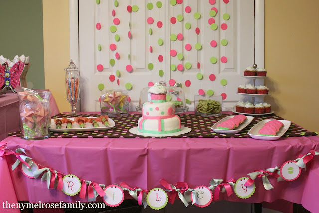 The party was inspired by Riley’s favorite book, Camilla the Cupcake Fairy by Tim Bugbird.  If you haven’t read it, I promise you won’t be sorry.  It’ll have your little princess even more excited about cupcakes than she already is.  My color scheme for the party was hot pink and lime green.  I tried to carry the color scheme throughout the entire party.  My absolute favorite part of the party was the dessert table.  I made absolutely everything, which included a three tiered fondant cupcake cake, cupcakes sprinkled with green fairy dust, magic wand pretzels, magic wand fruit kabobs, magic wand chocolate lollipops and cupcake sugar cookies.