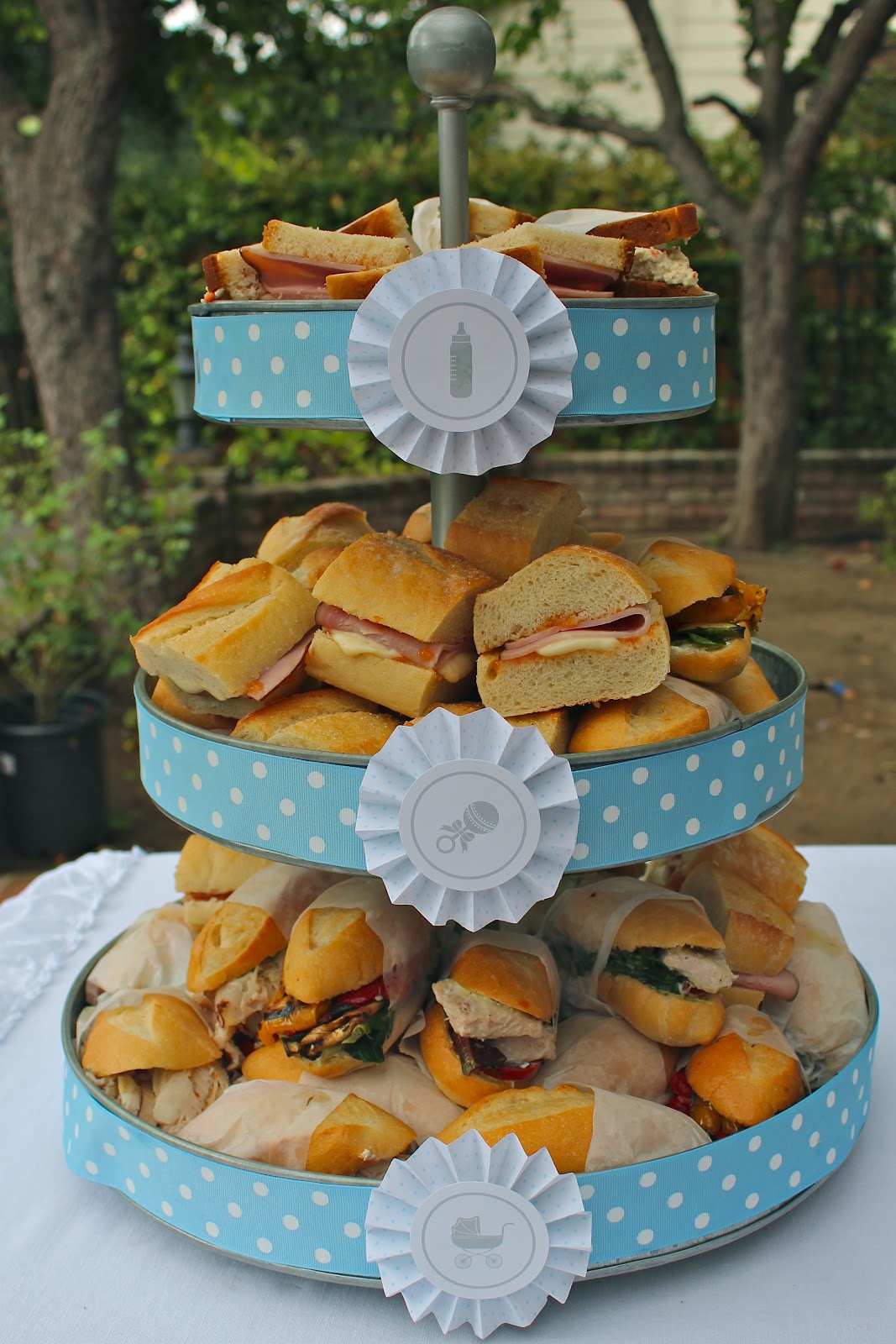 We settled on a white, silver and baby blue color scheme.  Lots of 36 inch white balloons tied with silver and blue tassels, which I made out of ribbons and a metallic fringe door curtain found at Party City, framed the yard.  Under the welcome sign was a bench with shake, rattle and roll pillows made by our mom. This is where the guest posed for pictures with the Nicole.  The shower was set to be outside but real showers made lots of last minute adjustments necessary.