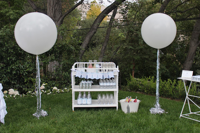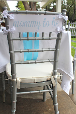 We settled on a white, silver and baby blue color scheme.  Lots of 36 inch white balloons tied with silver and blue tassels, which I made out of ribbons and a metallic fringe door curtain found at Party City, framed the yard.  Under the welcome sign was a bench with shake, rattle and roll pillows made by our mom. This is where the guest posed for pictures with the Nicole.  The shower was set to be outside but real showers made lots of last minute adjustments necessary.