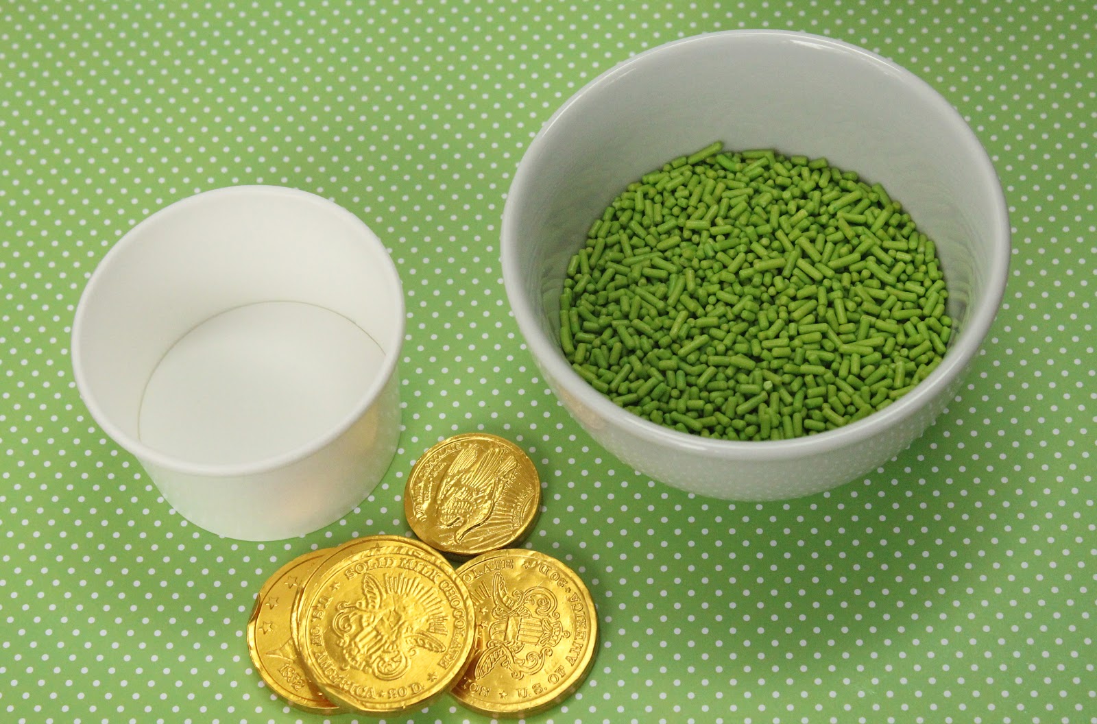Scoop ice cream into cups and roll in the sprinkles. Add the coins, ribbon and tags and eat up!