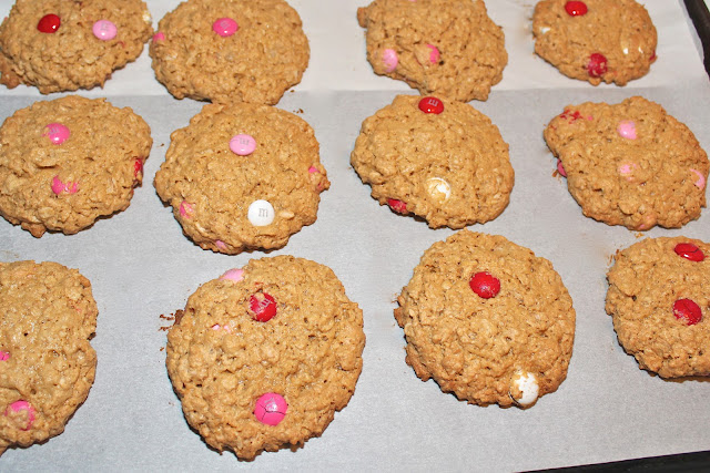 This is one of my sister’s favorite cookies from college. I love making them for Valentine’s Day because the colors of the Valentines M & M’s look so nice with the color of the dough. They also look great with the standard M & M mix.
