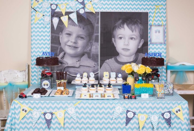 Aren’t you glad it’s Friday? I always love twin birthday parties! This Monster Truck Party that Tali of A Party Studio is double the fun. Tali chose a sweet blue and yellow color scheme for boys Avry and Asher who were turning four. The clever food names and bright blod patterns make this party a smash. Tali writes: Avry and Asher love monster trucks so